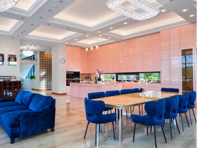 На первом этаже дома располагается просторная гостиная, объединённая с обеденной зоной и кухней, 2 спальни со своими ванными комнатами, хозяйственное помещение, гараж, тренажёрный зал и бассейн.
