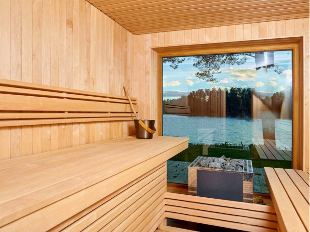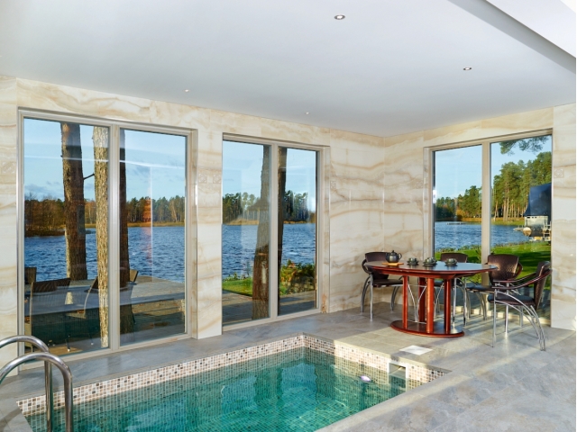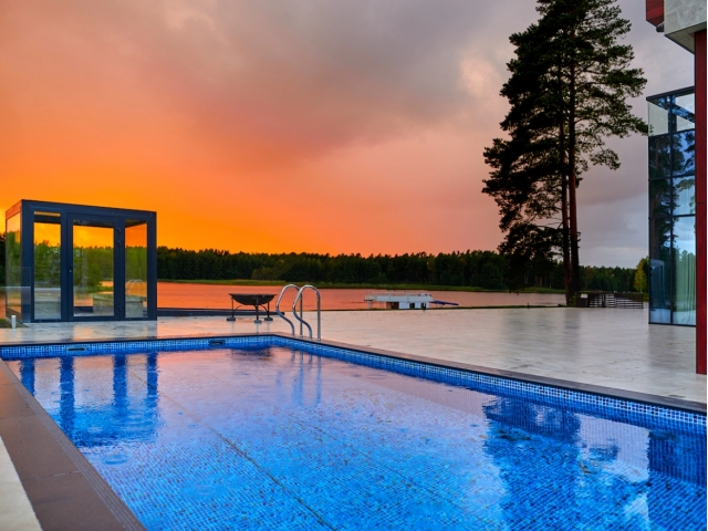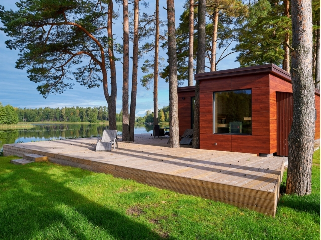 The property features a swimming pool and sauna overlooking the lake and pine forest.